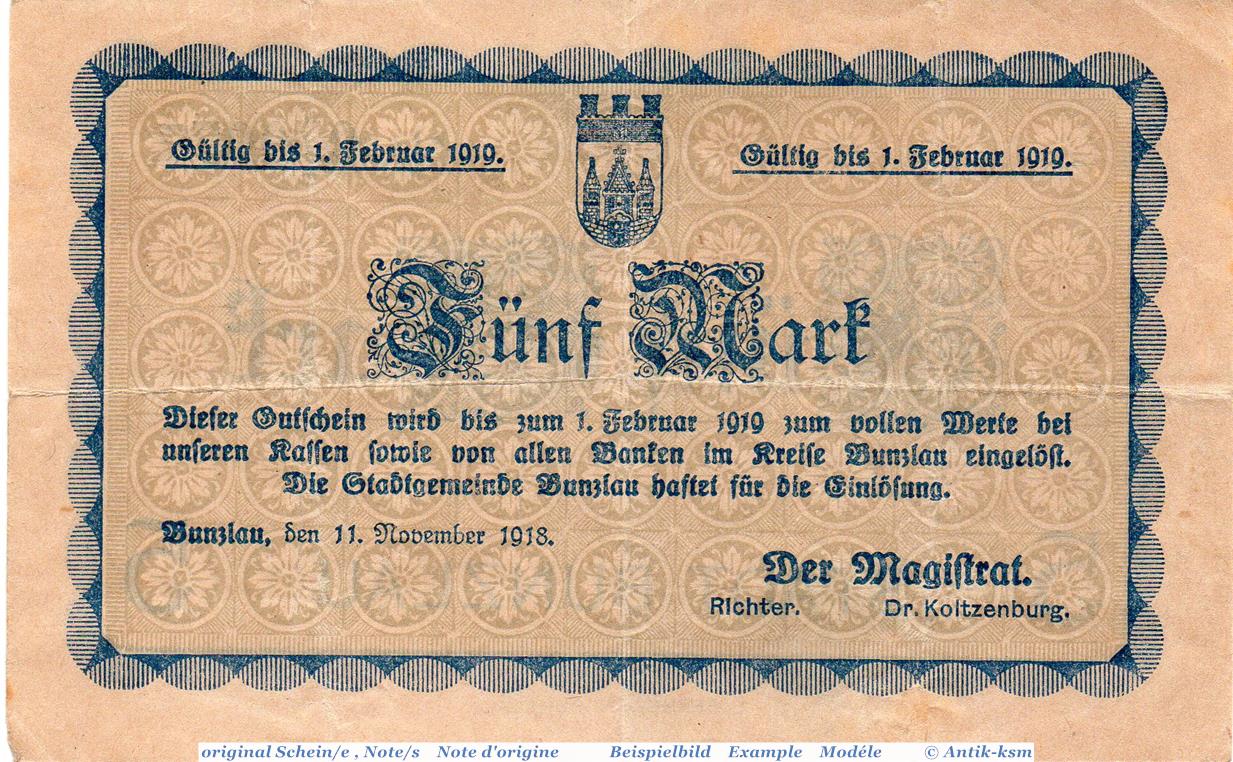 Banknote Bunzlau , 5 Mark Schein in gbr. Geiger 072.01.b , 11.11.1918 , Schlesien Großnotgeld