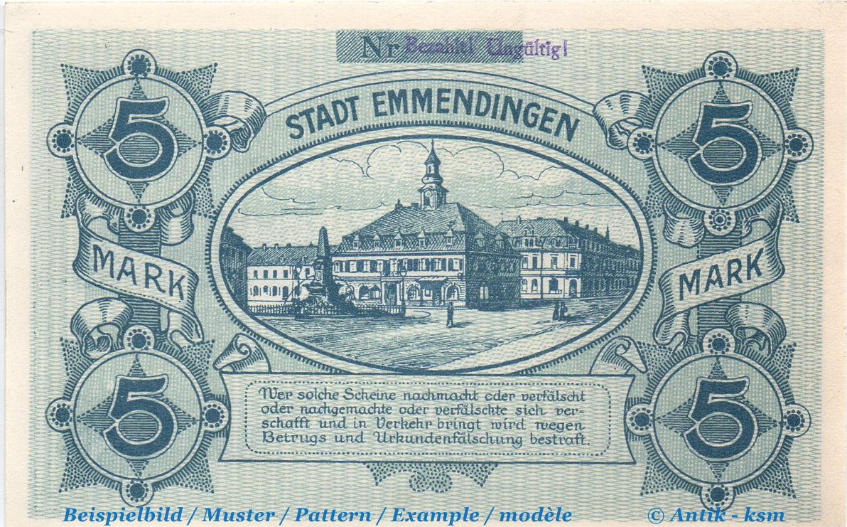 Banknote Emmendingen , 5 Mark Schein in kfr. E , Geiger 133.02.b , 30.10.1918 , Baden Großnotgeld