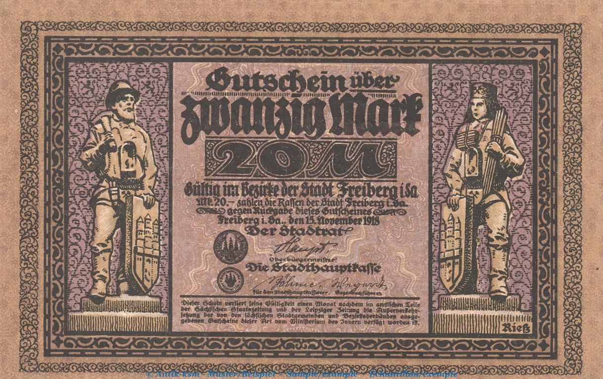 Gutschein / Banknote über Zwanzig Mark , Stadtrat und Stadthauptkasse Freiberg , Großnotgeld 1918