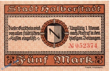 Notgeld über Fünf Mark , Stadt Halberstadt , Großnotgeld & Inflation