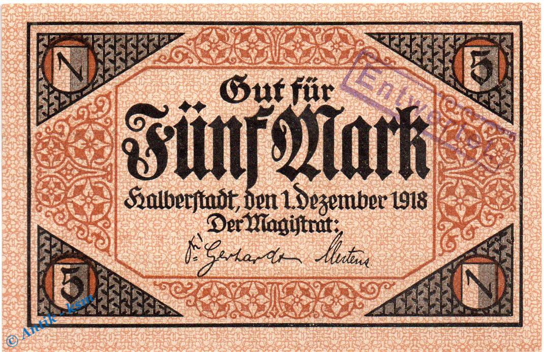 Banknote Halberstadt , 5 Mark Schein in in kfr. E , Geiger 209.01 , 01.12.1918 , Sachsen Großnotgeld