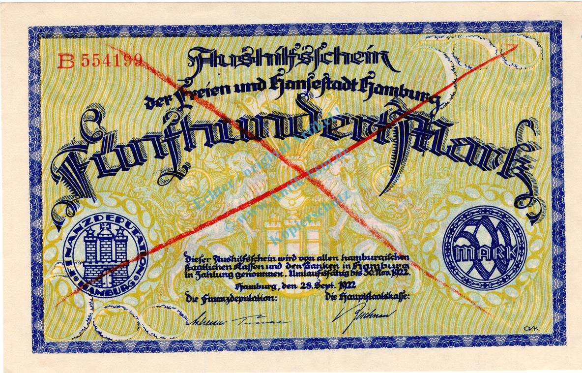 Hamburg , Banknote 500 Mark Schein unc-kfr. Müller 1975.2.a , Hamburg 1922 Inflation