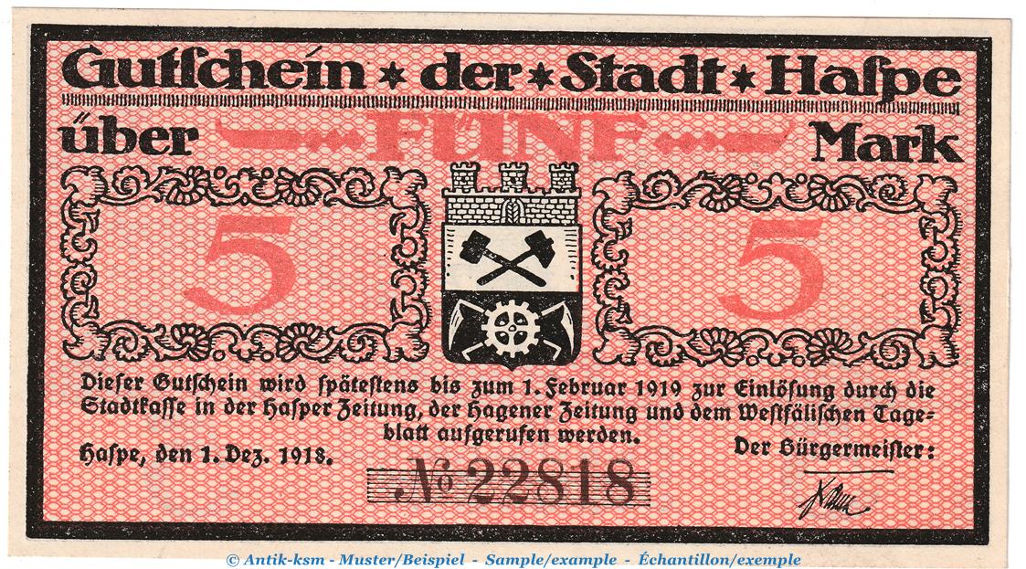 Notgeld Stadt Haspe , 5 Mark Schein in kfr. Geiger 224.01 von 1918 , Westfalen Grossnotgeld