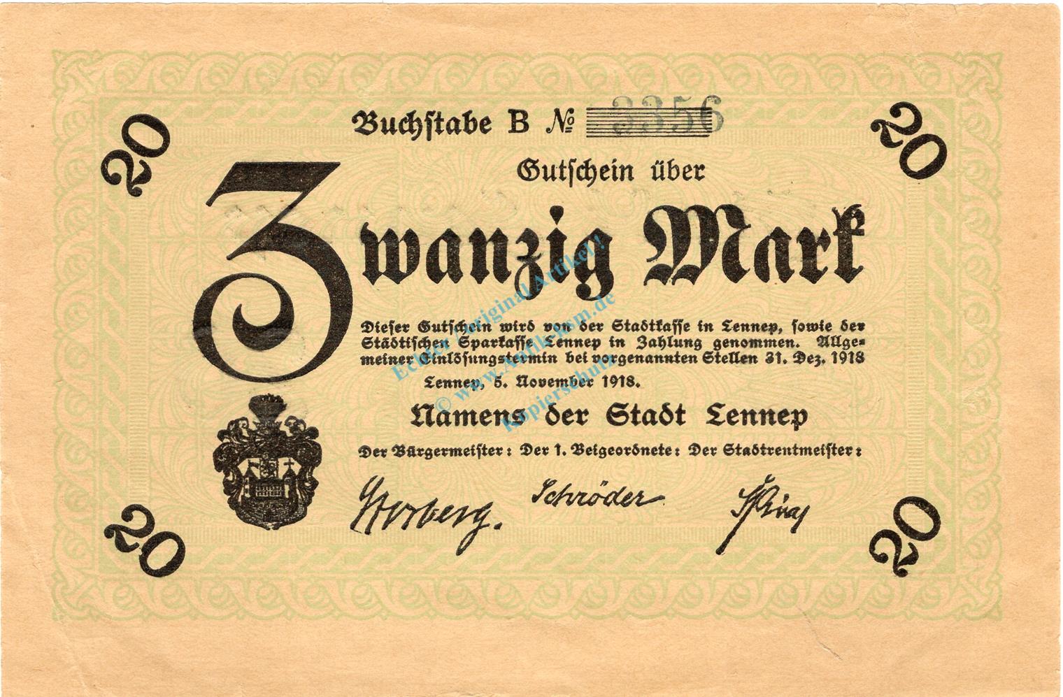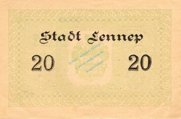 Lennep , Banknote 20 Mark Schein f-kfr. Geiger 315.08.a , Rheinland 1918 Grossnotgeld