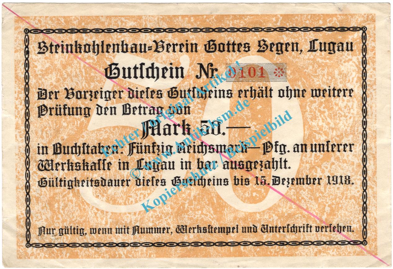Gutschein / Banknote über Fünfzig Mark , Steinkohlenbau-Verein Gottes Segen Lugau , Großnotgeld 1918