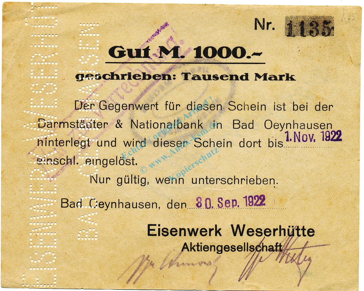 Bad Oeynhausen , Banknote 1.000 Mark Schein gbr. Müller 3425... Westfalen 1922 Inflation 3579