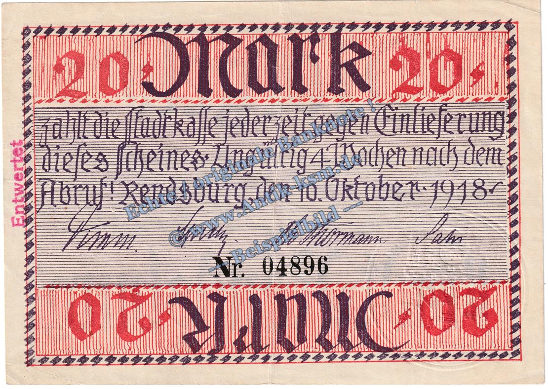 Rendsburg , Banknote 20 Mark Schein in gbr.E , Geiger 447.03 , Schleswig 1918 Grossnotgeld