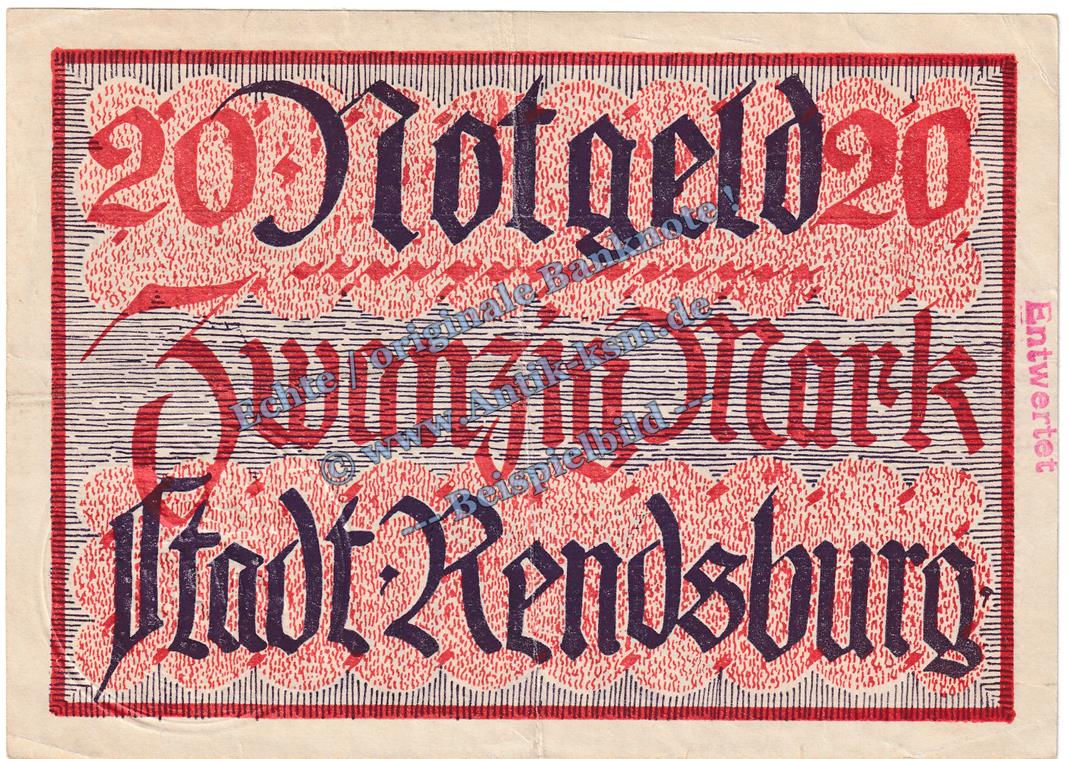 Gutschein / Banknote über Zwanzig Mark , Stadt Rendsburg , Großnotgeld