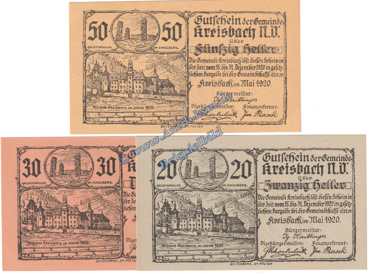 Kreisbach , Notgeld Set mit 3 Scheinen in kfr. K-K 470.e , Niederösterreich von 1920