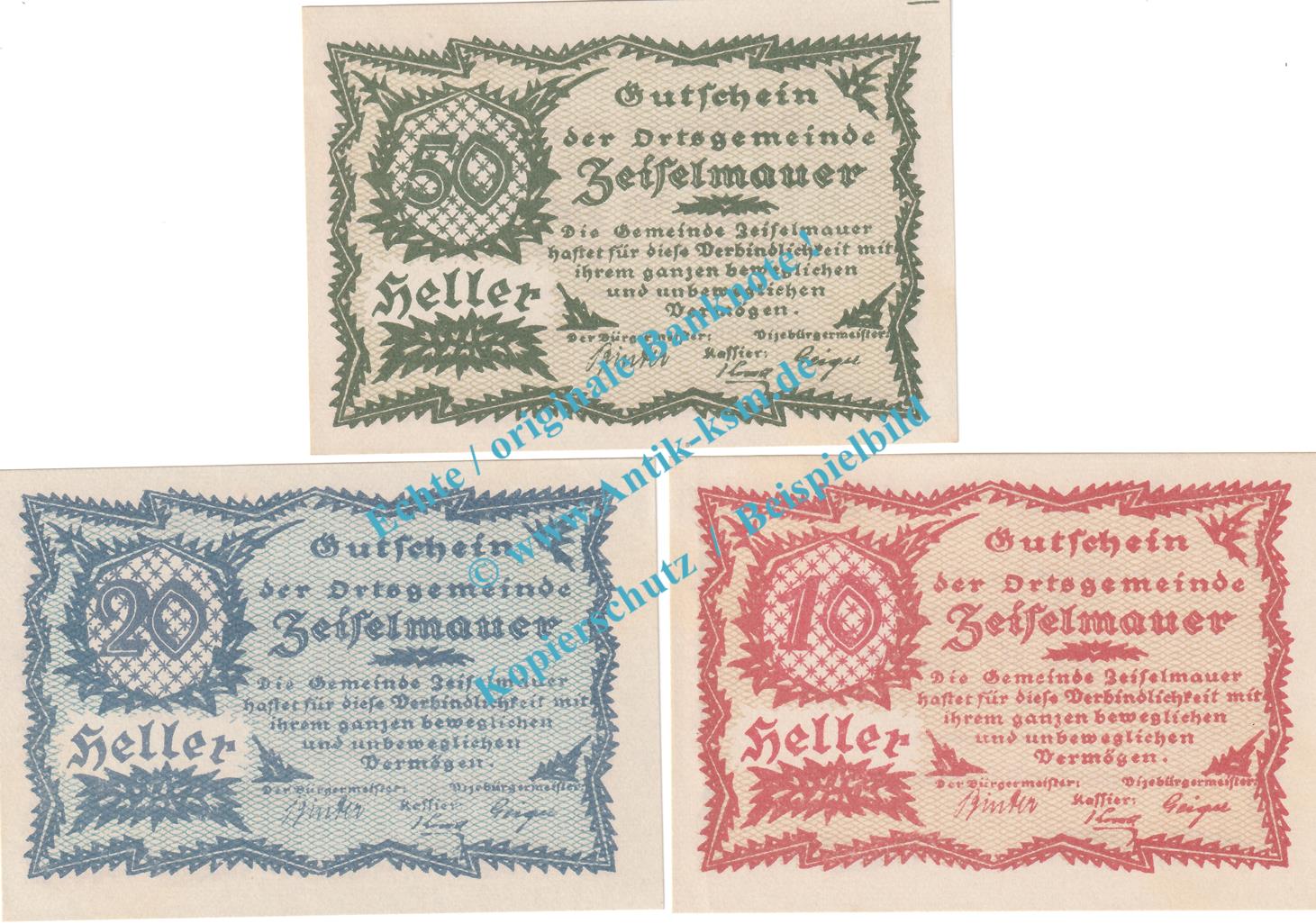 Gutscheine / Banknoten der Ortsgemeinde Zeiselmauer , österreichisches Notgeld