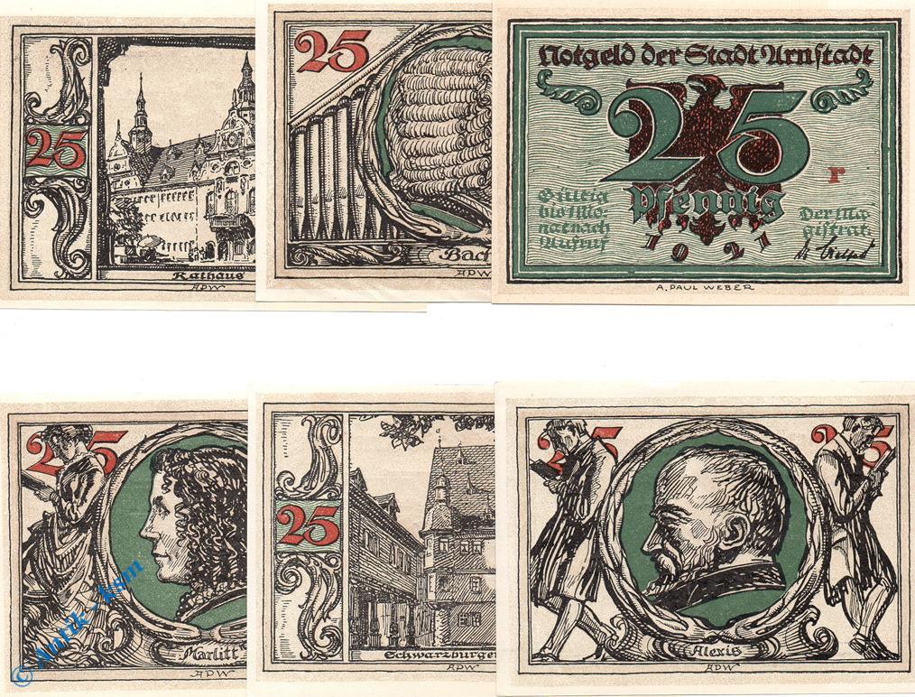 Notgeld Arnstadt , Personen und Gebäude , Set mit 6 Scheinen , Mehl Grabowski 43.2 , von 1921 , Thüringen Serien Notgeld