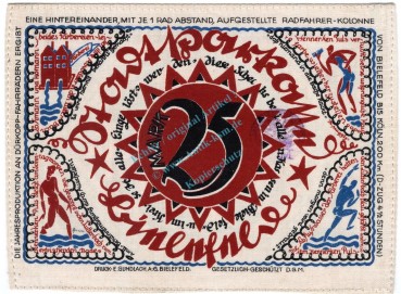 Bielefeld , Notgeld 25 Mark Nr.1 -Seide- unc-kfr. M-G 103.8.b , Westfalen 1921 Seriennotgeld
