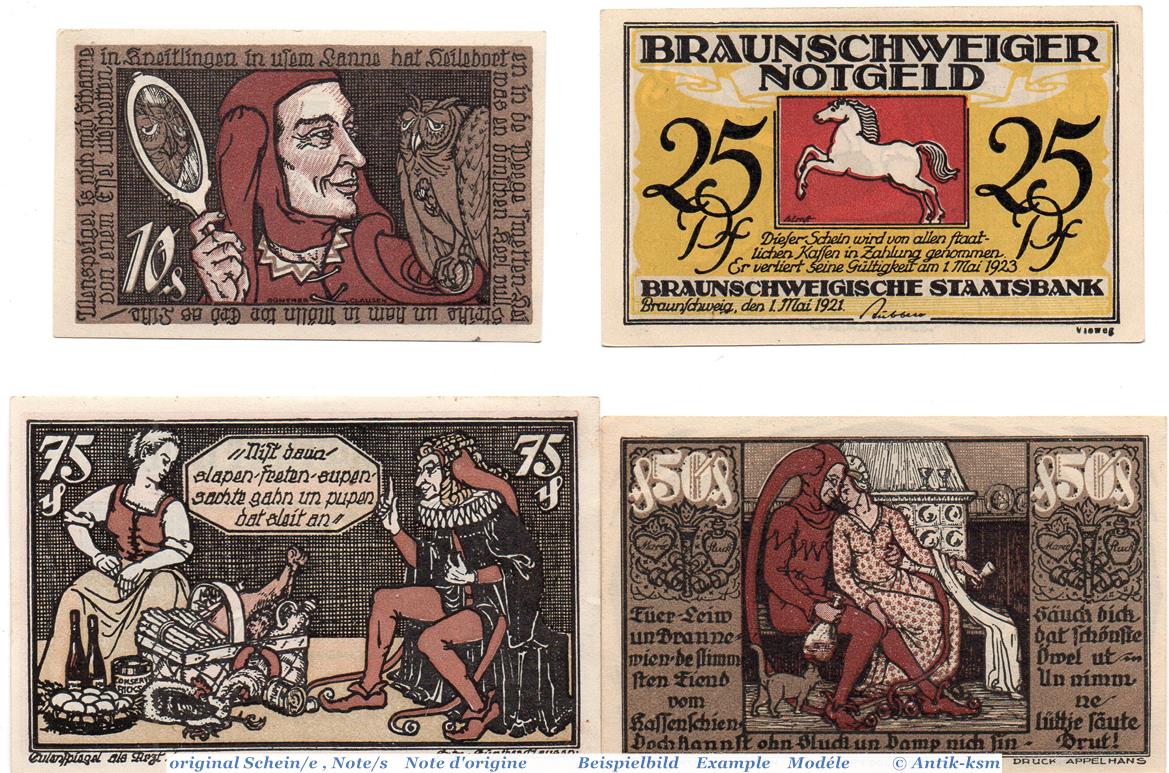 Notgeld Braunschweig , Eulenspiegel Set mit 4 Scheinen in kfr. Mehl Grabowski 155.1 , von 1921 , Niedersachsen Seriennotgeld