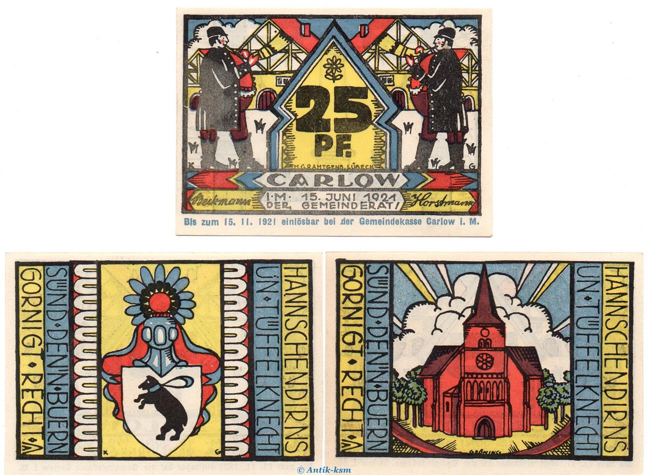 Notgeld Gemeinde Carlow 221.1 , Set mit 3 Scheinen in kfr. von 1921 , Mecklenburg Vorpommern Seriennotgeld