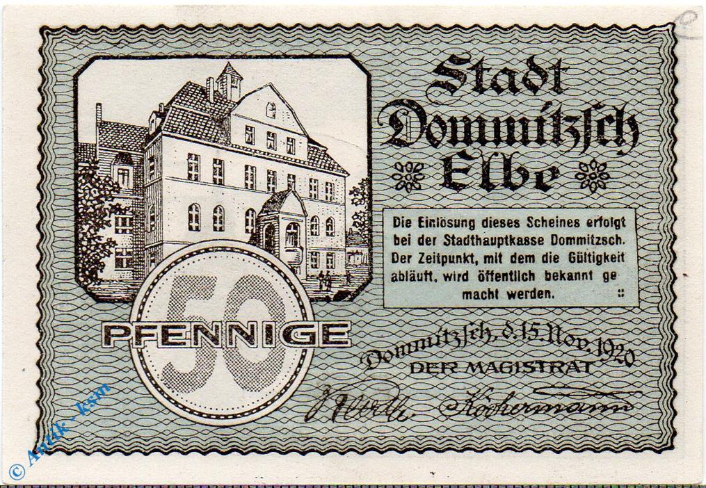 Notgeld Dommitzsch , 50 Pfennig Schein , Rs schwarz , Mehl Grabowski 279.1 , von 1920 , Sachsen Seriennotgeld