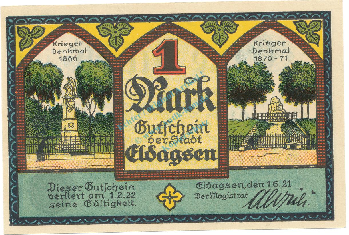 Seriennotgeld : Stadt Eldagsen , Hannover / Niedersachsen , 1 Mark Schein -Kriegerdenkmal- o.Wz.