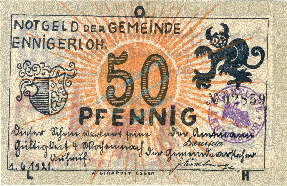 Ennigerloh , Notgeld 50 Pfennig Nr.4 -Gem- Stpl- in unc-kfr 338.2.a , Westfalen 1921 Seriennotgeld