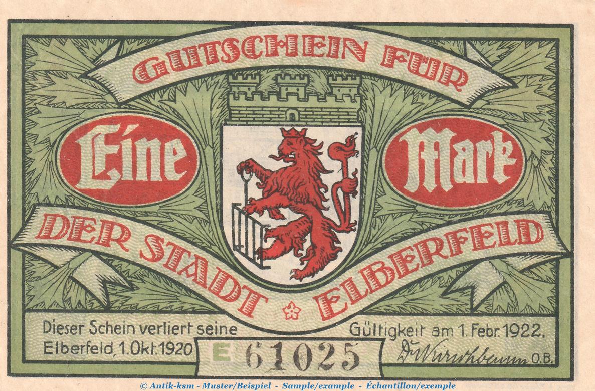 Notgeld Stadt Elberfeld 324.1 , 1 Mark Schein Nr.4 -grün- in kfr. von 1920 , Westfalen Seriennotgeld