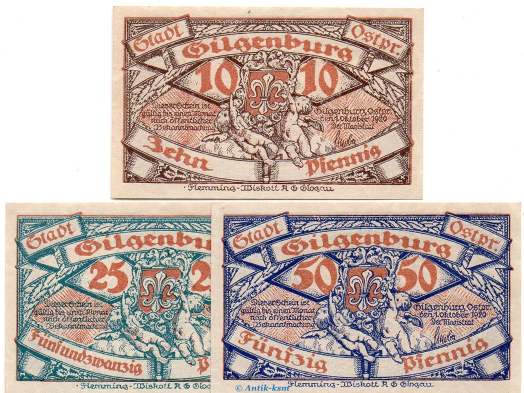 Notgeld Stadt Gilgenburg 429.1 , Set mit 3 Scheinen in kfr. von 1920 , Ostpreussen Seriennotgeld