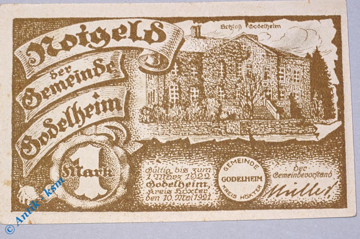 Notgeld Godelheim , 1 Mark Schein braun , Mehl Grabowski 446.1 b , von 1921 , Westfalen Seriennotgeld