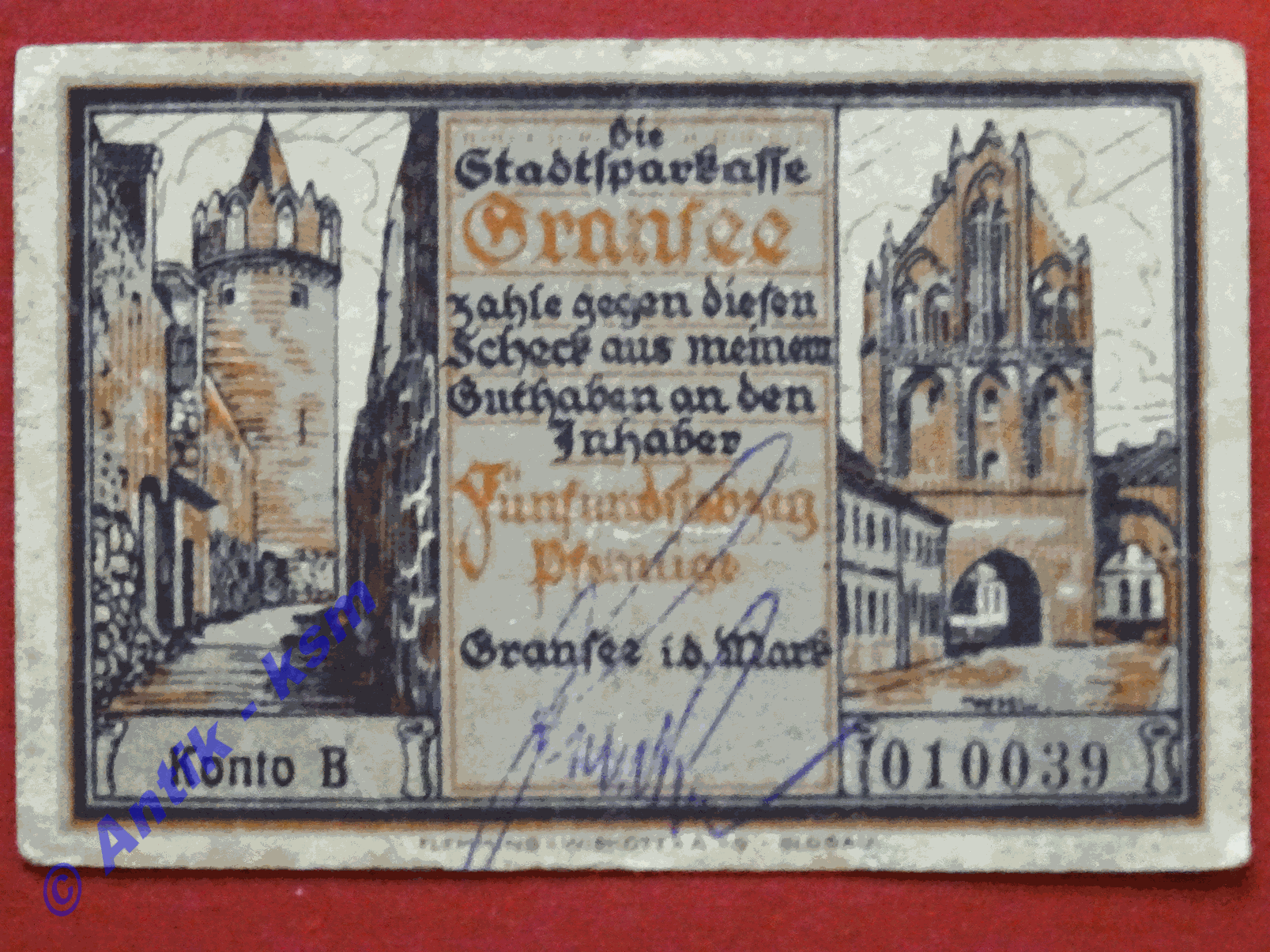 Notgeld Gransee , Einzelschein über 75 Pfennig mit Unterschrift , Mehl Grabowski 465.1 B , Seriennotgeld Brandenburg