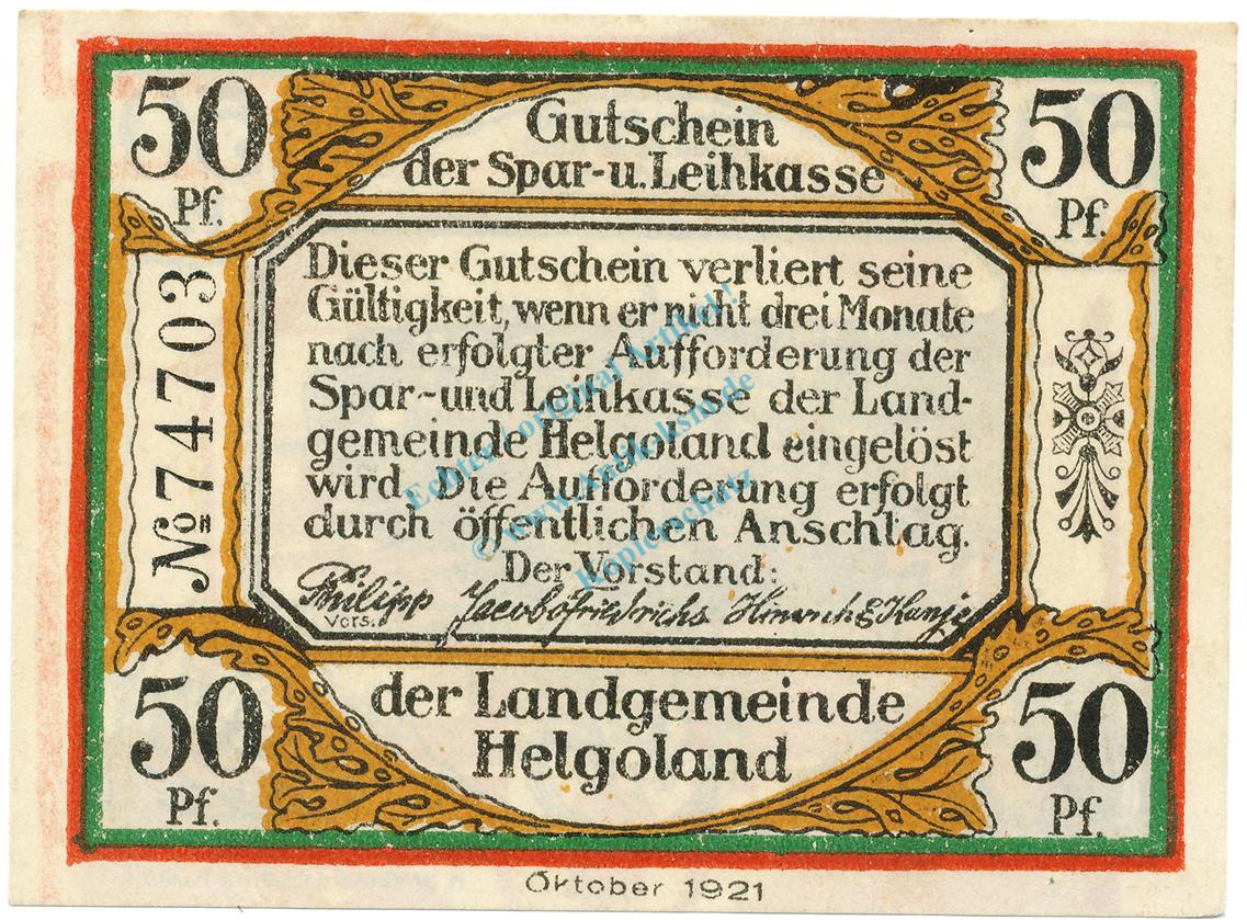 Helgoland , Notgeld 50 Pfennig -Fehldruck- unc-kfr. M-G 595.4 , SH 1921 Seriennotgeld -5779-