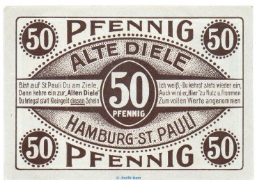 Notgeld Alte Diele Hamburg 515.2 , 50 Pfennig Schein Nr 4 in kfr. o.D. Hamburg Seriennotgeld