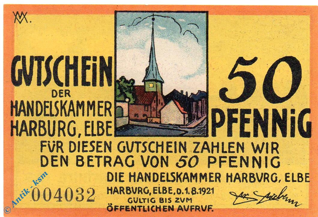 Notgeld Harburg , 50 Pfennig Schein gelb in kfr. Mehl Grabowski 579.1 , von 1921 , Hamburg Seriennotgeld