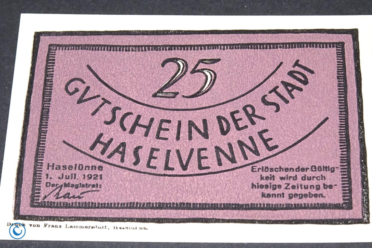 Notgeld Haselünne , 25 Pfennig Schein , Mehl Grabowski 583.1 e , von 1921 , Niedersachsen Seriennotgeld