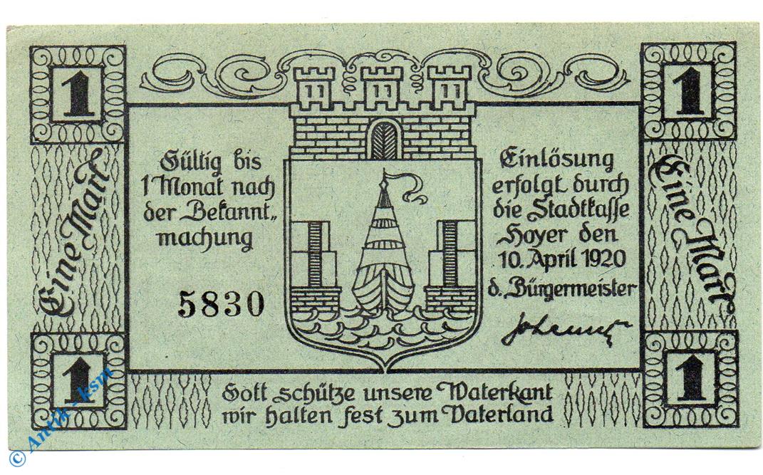 Notgeld Hoyer , 1 Mark Schein in kfr. Mehl Grabowski 633.1 , von 1920 , Dänisch Nordschleswig Seriennotgeld