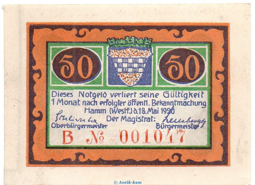 Banknote , Notgeld der Stadt Hamm , Seriennotgeld , breiter Rand