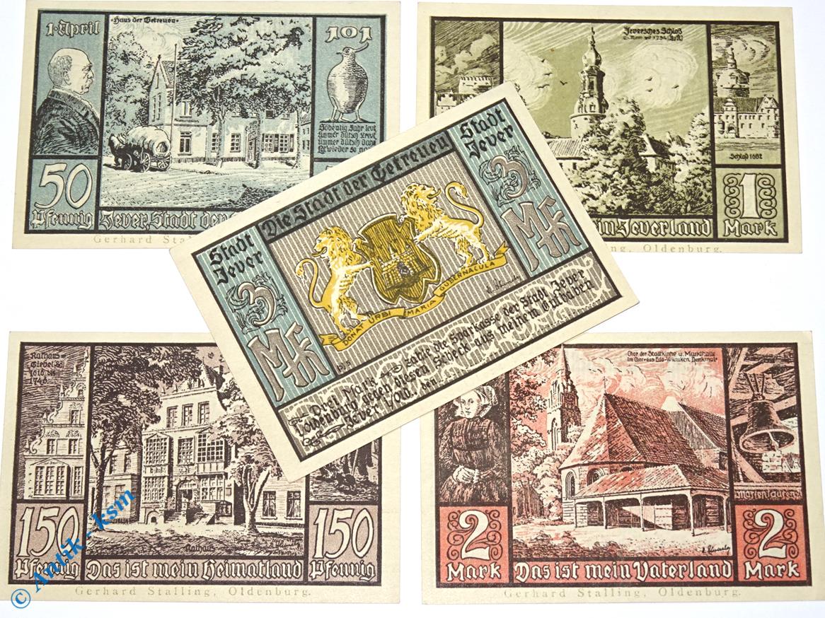 Notgeld Stadt Jever , Sparkasse der Stadt , Niedersachsen , kompletter Satz mit 5 Scheinen in kassenfrischer Erhaltung , Seriennotgeld , 661A.1 , von 1922
