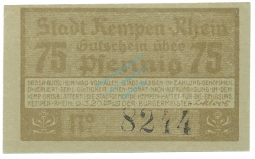 Kempen , Notgeld 75 Pfennig Schein Nr.3 unc-kfr. M-G 689.3 , RHL 1920 Seriennotgeld -5788-