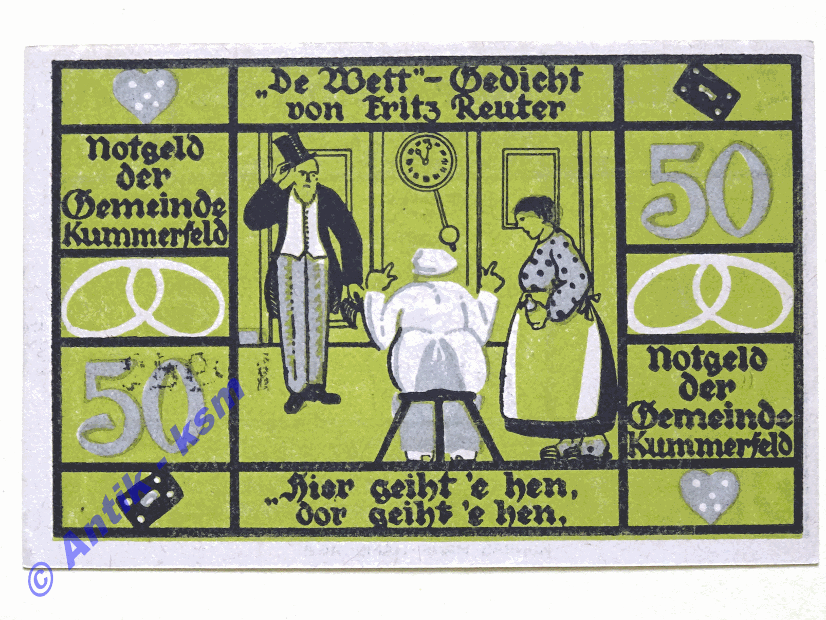 Der Notgeldsatz besteht aus : 50 Pfennig , 2 Männer und 1 Frau