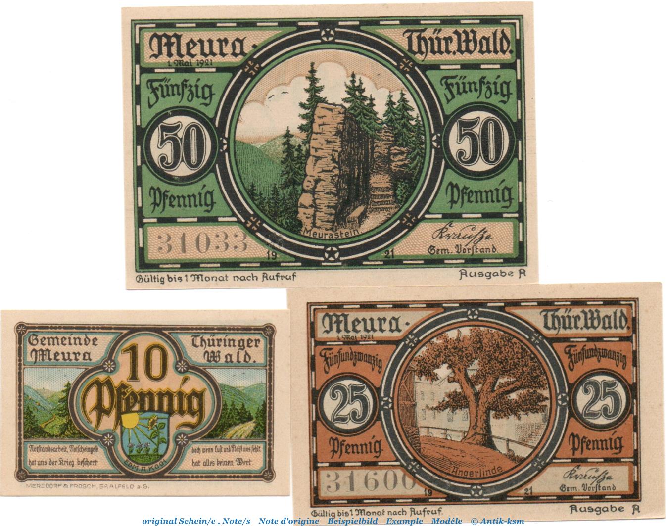 Notgeld Gemeinde Meura 886.1.a-b , 2 Sets mit 3 Scheinen in kfr. von 1921 , Thüringen Seriennotgeld
