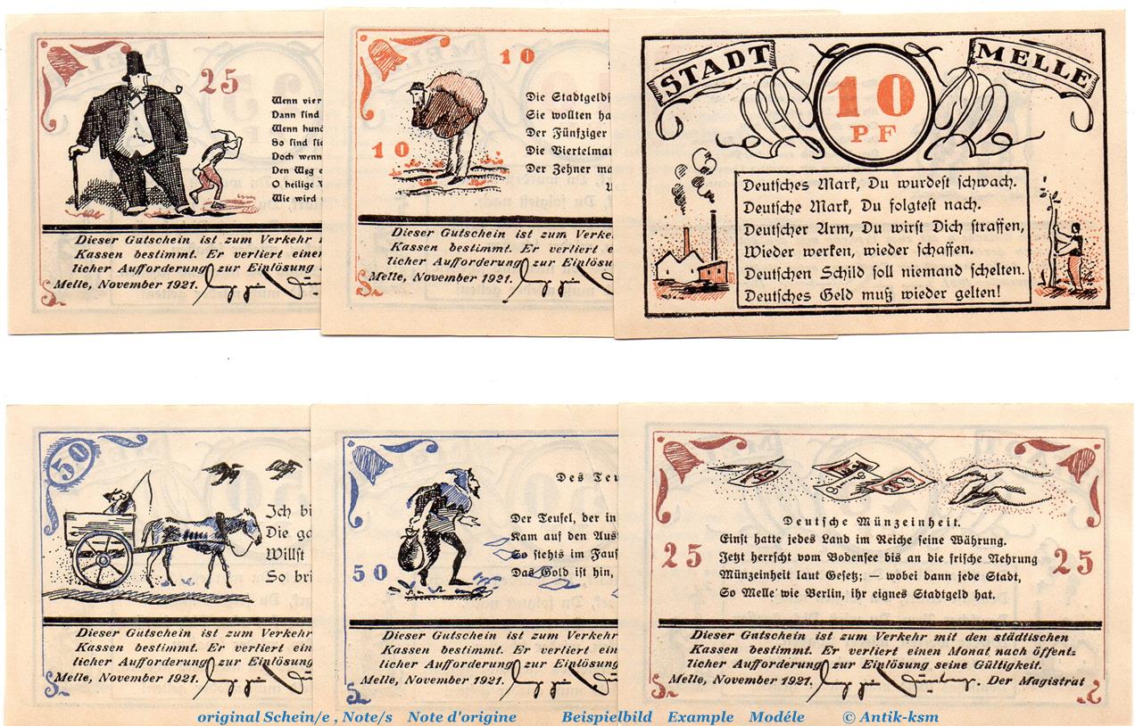 Notgeld Stadt Melle 879.1 , Set mit 6 Scheinen in kfr. von 1921 , Niedersachsen Seriennotgeld