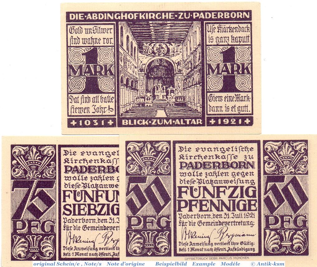 Notgeld Paderborn , Kirchenkasse Set mit 3 Scheinen in kfr. Mehl Grabowski 1042.1 , von 1921 , Westfalen Seriennotgeld