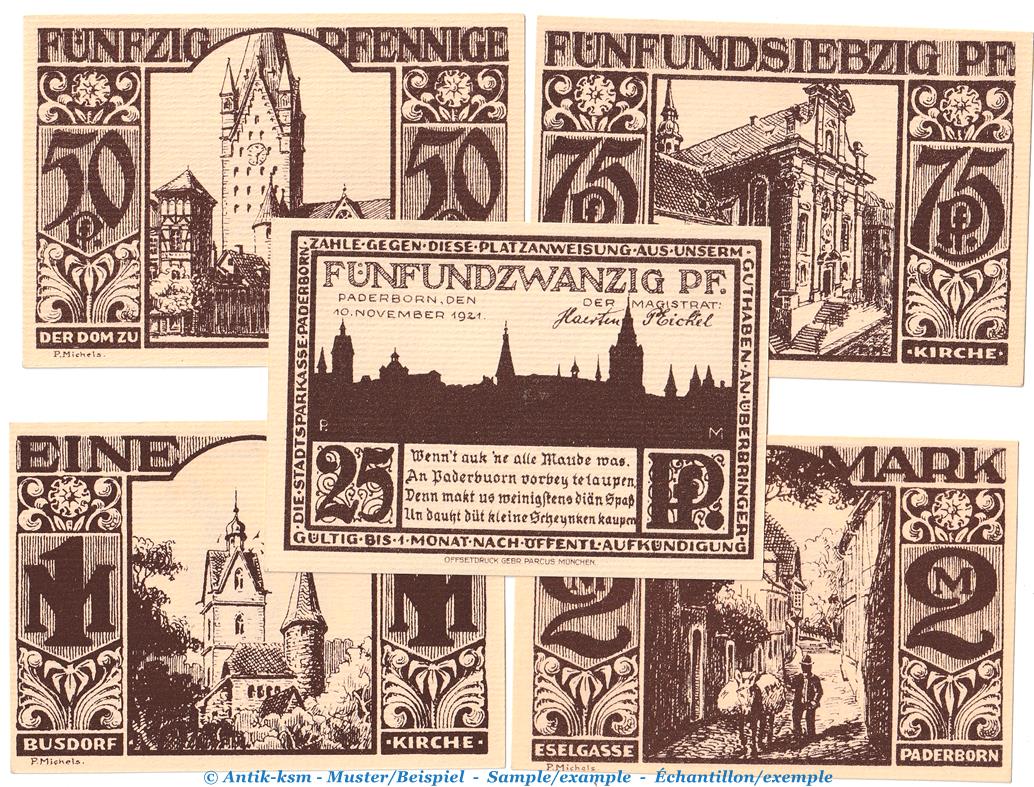 Notgeld Stadt Paderborn 1043.5 , Set it 5 Scheinen in kfr. von 1921 , Westfalen Seriennotgeld