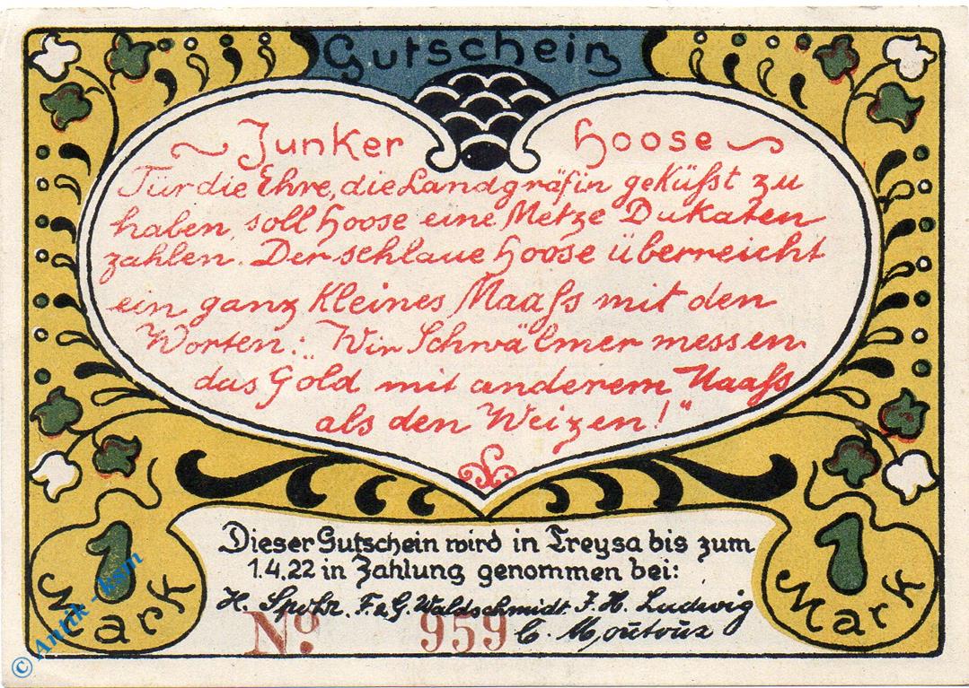 Notgeld H. Spohr Treysa 1340.1.b , 1 Mark Schein Kn = braun in kfr. o.D. Hessen Seriennotgeld