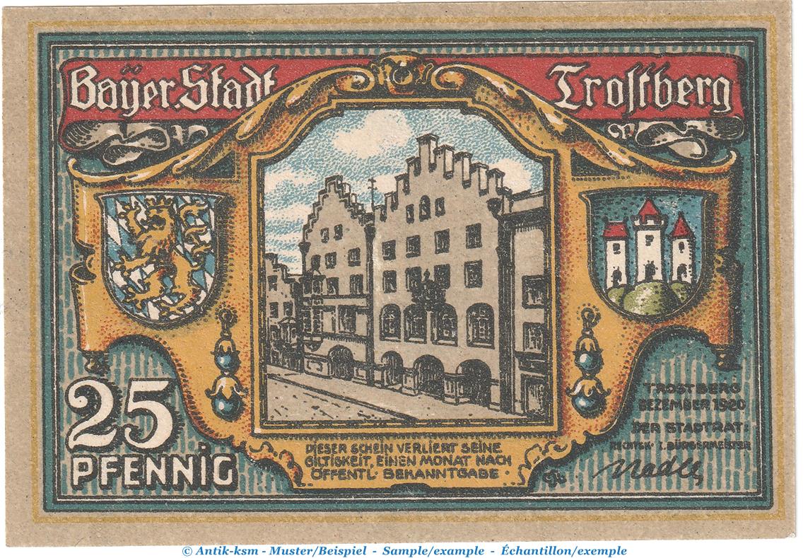 Notgeld Stadt Trostberg 1348.3 , 25 Pfennig --WZ weiß-- in kfr. o.D. Bayern Seriennotgeld
