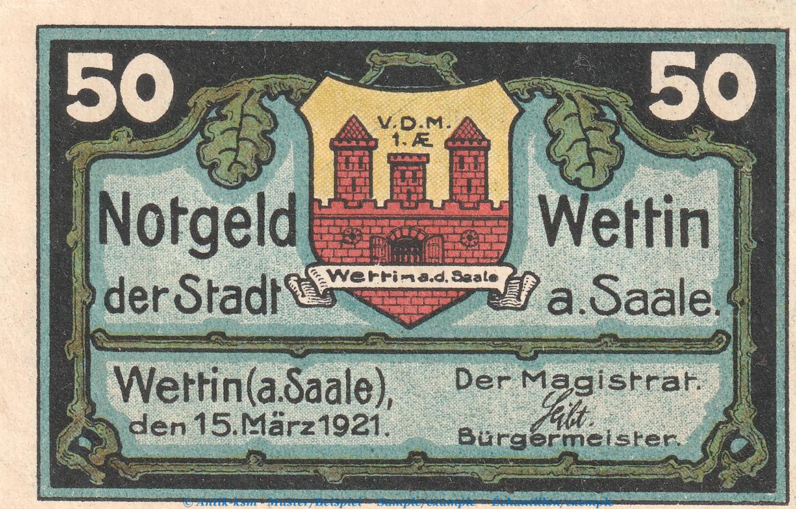 Notgeld Stadt Wettin 1421.2 , 50 Pfennig Schein in kfr. von 1921 , Sachsen Anhalt Seriennotgeld