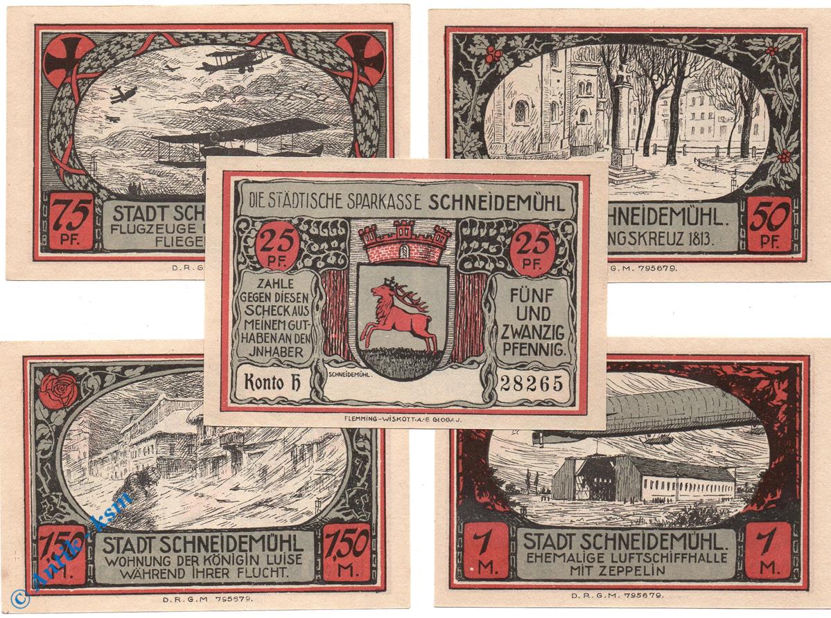 Notgeld Schneidemühl , Set mit 5 Scheinen rot , Mehl Grabowski 1191.2 B , Posen Serien Notgeld