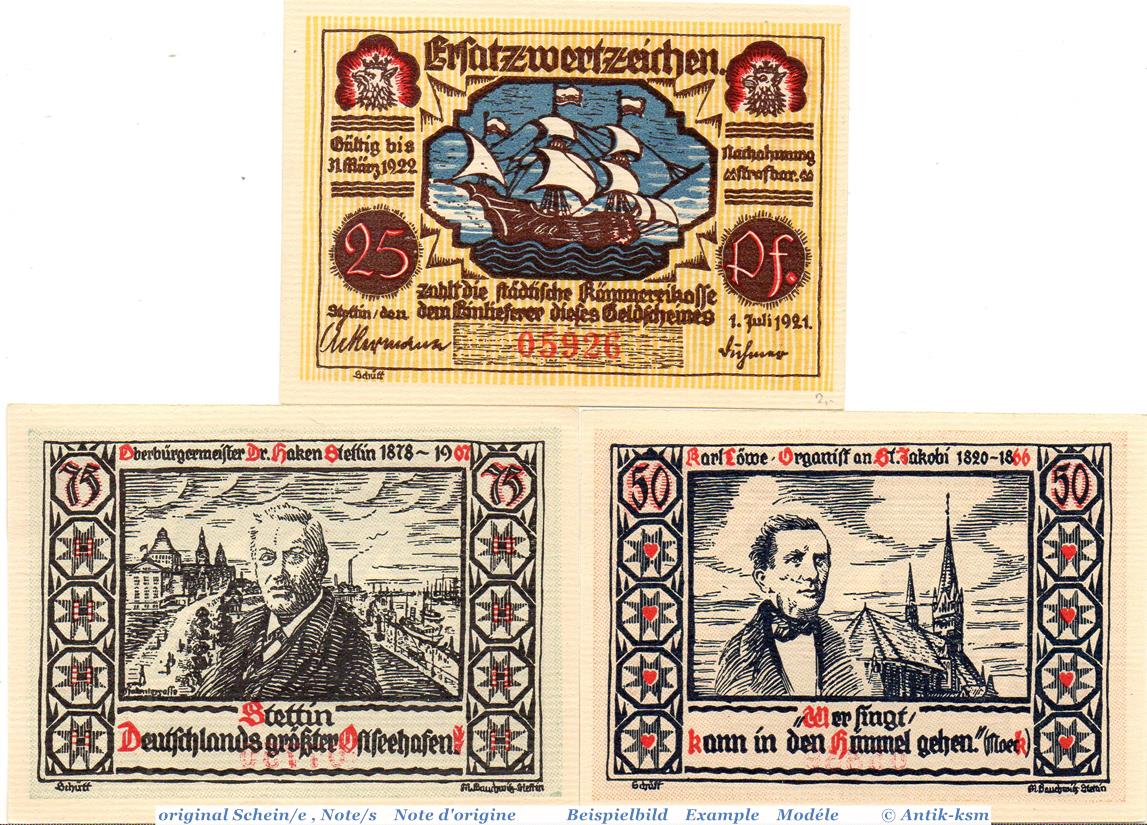 Notgeld Stettin , Set mit 3 Scheinen in kfr. Mehl Grabowski 1270.2 , von 1921 , Pommern Seriennotgeld