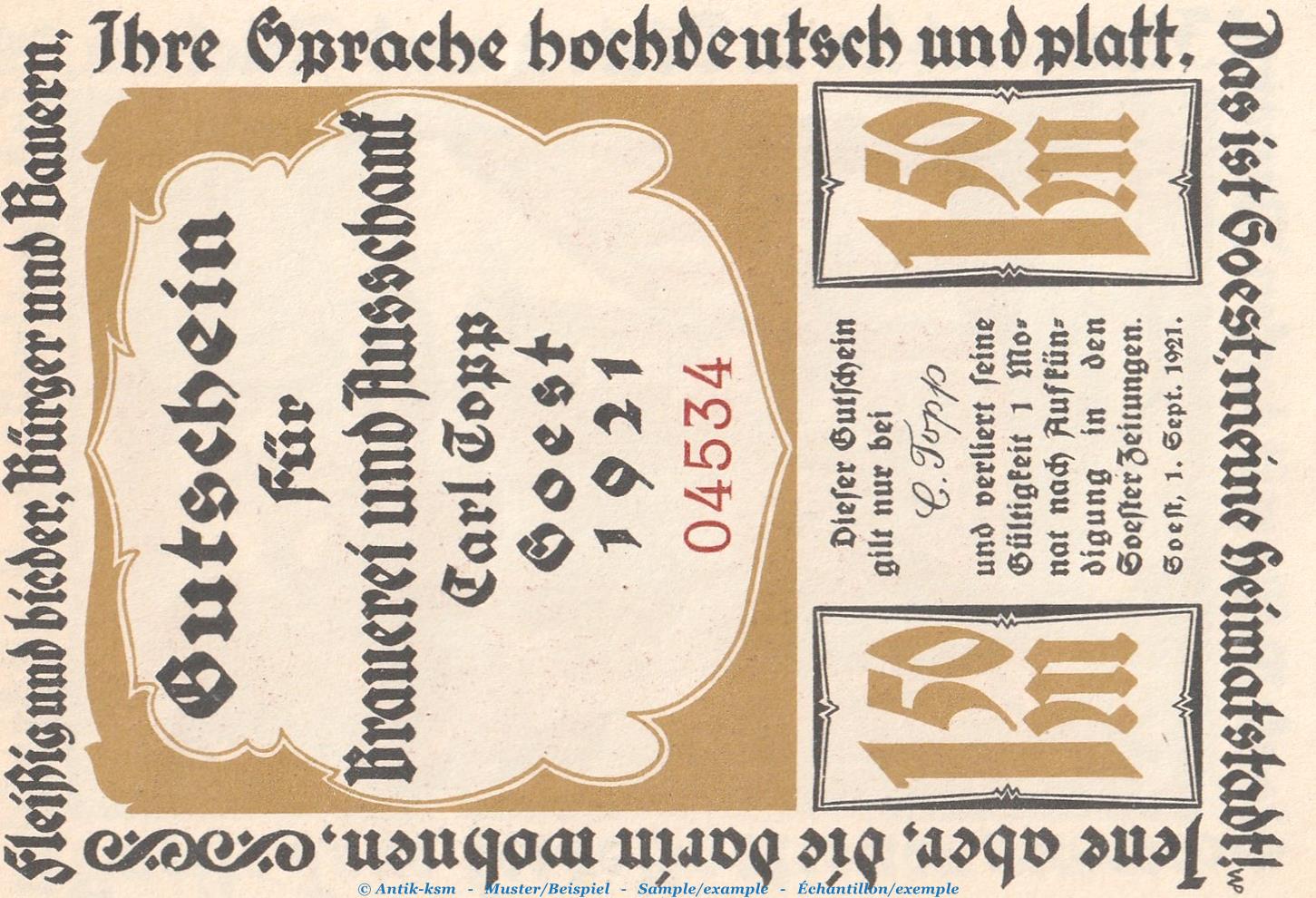 Gutschein / Banknote Brauerei und Ausschank Carl Topp Soest , Seriennotgeld