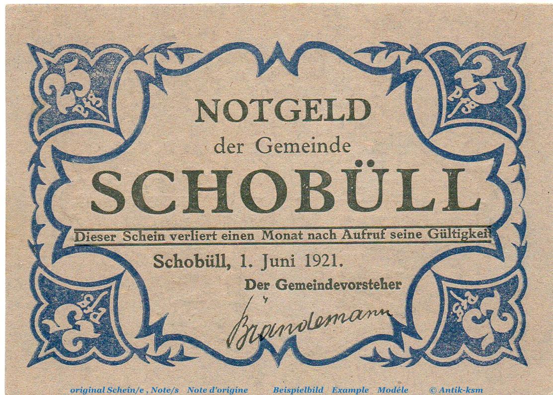 Notgeld Gemeinde Schobüll 1194.8 , 25 Pfennig Schein grau in kfr. von 1921 , Schleswig Holstein Seriennotgeld