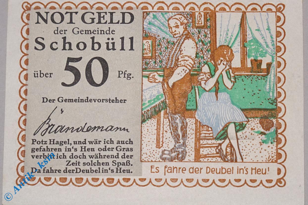 Notgeld Schobüll , 50 Pfennig Schein Nr 2 , Wz 9,5 mm , Mehl Grabowski 1194.2 , von 1921 , Schleswig Holstein Seriennotgeld