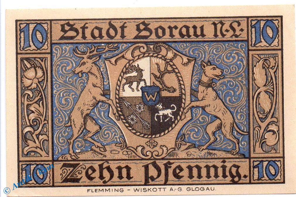 Notgeld Sorau , 10 Pfennig Schein in kfr. Mehl Grabowski 1247.1 a , von 1921 , Brandenburg Seriennotgeld