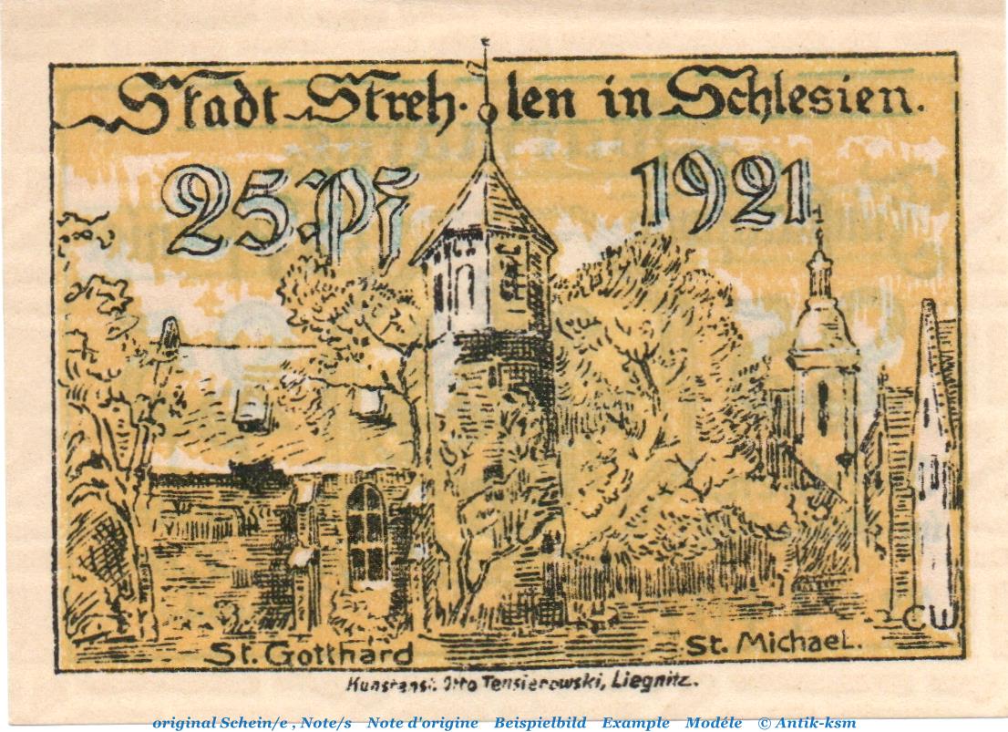 Notgeld Stadt Strehlen 1282.1.b, 25 Pfennig , Linien durchgehend in kfr. von 1921 , Schlesien Seriennotgeld