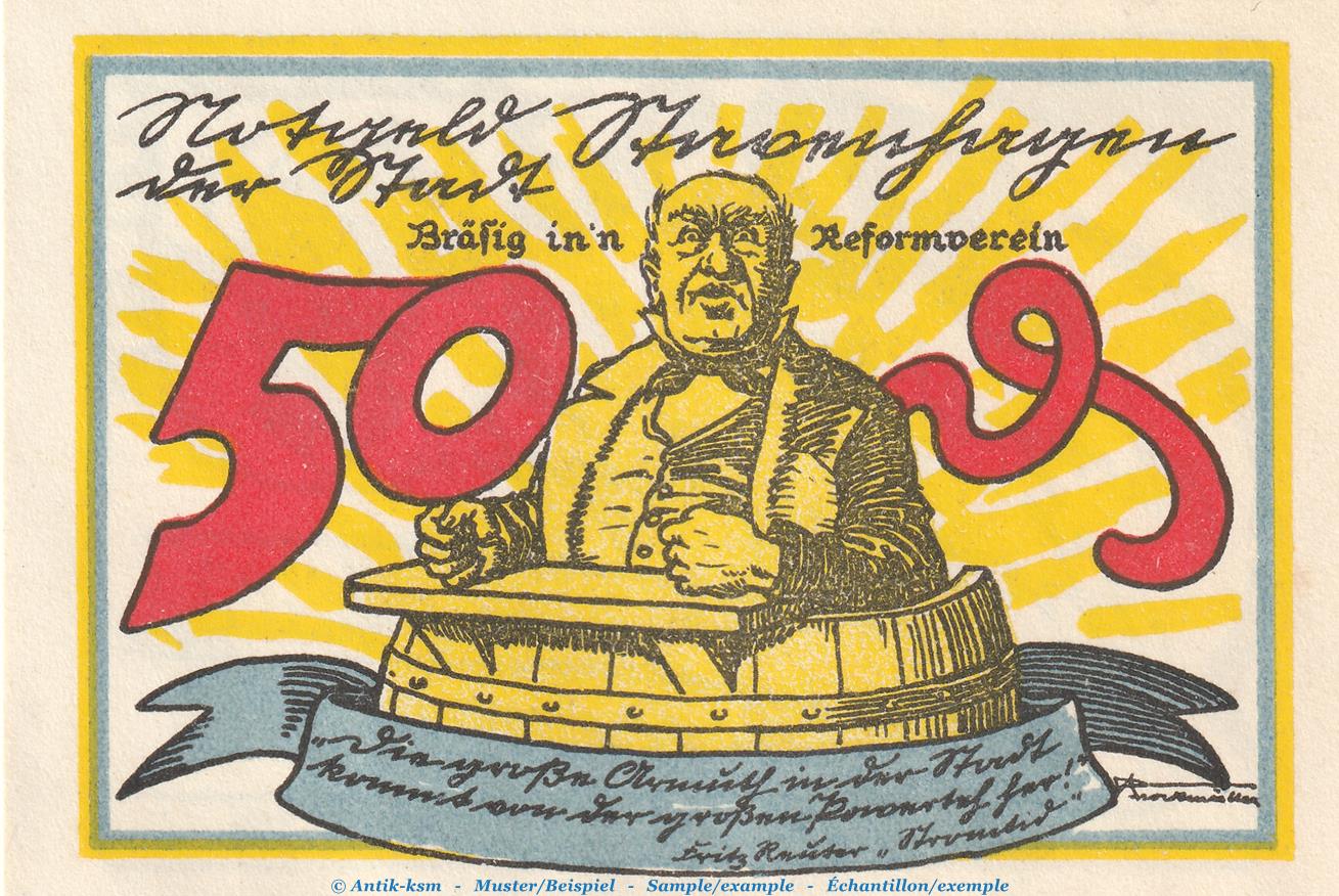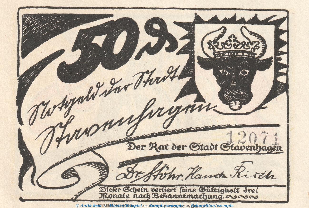 Notgeld Stadt Stavenhagen 1257.1.a , 50 Pfennig Schein mit Kennummer in kfr. o.D. , Mecklenburg Vorpommern Seriennotgeld