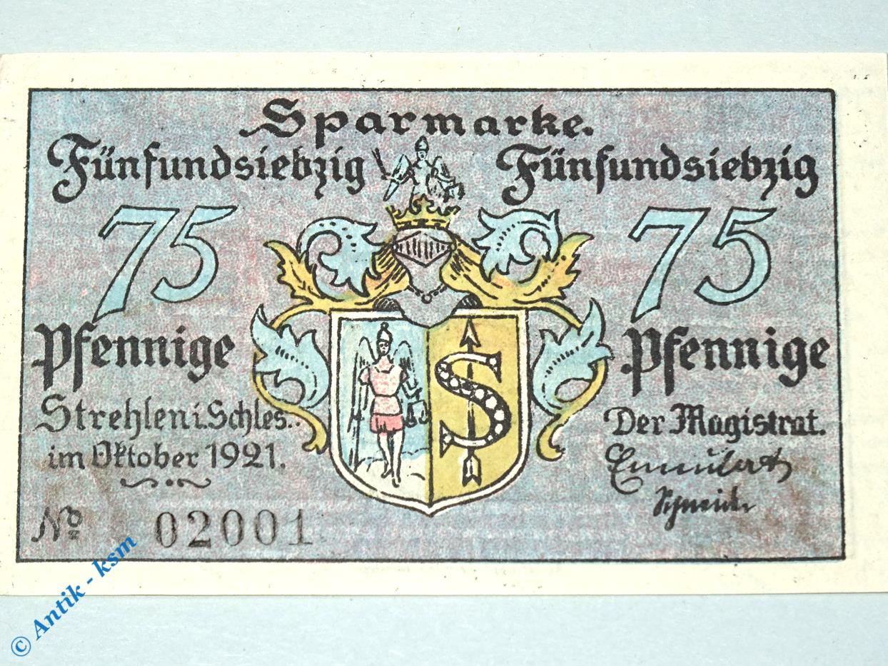 Notgeld Strehlen , Schlesien , Polen Strzelin , Einzelschein 75 Pfennig , Strehlen vom Mühlberg , Seriennotgeld , 1282.1 N , von 1921